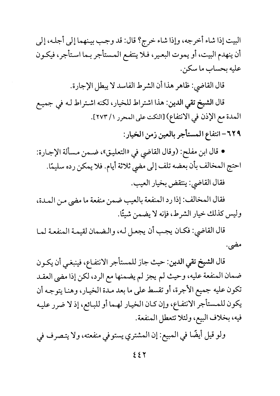 - قال ابن مفلح: (وقال القاضي في «التعليق»، ضمن مسألة الإجارة: احتج المخالف بأن بعضه تلف إلى مضي ثلاثة أيام. فلا يمكن رده سليمًا.
