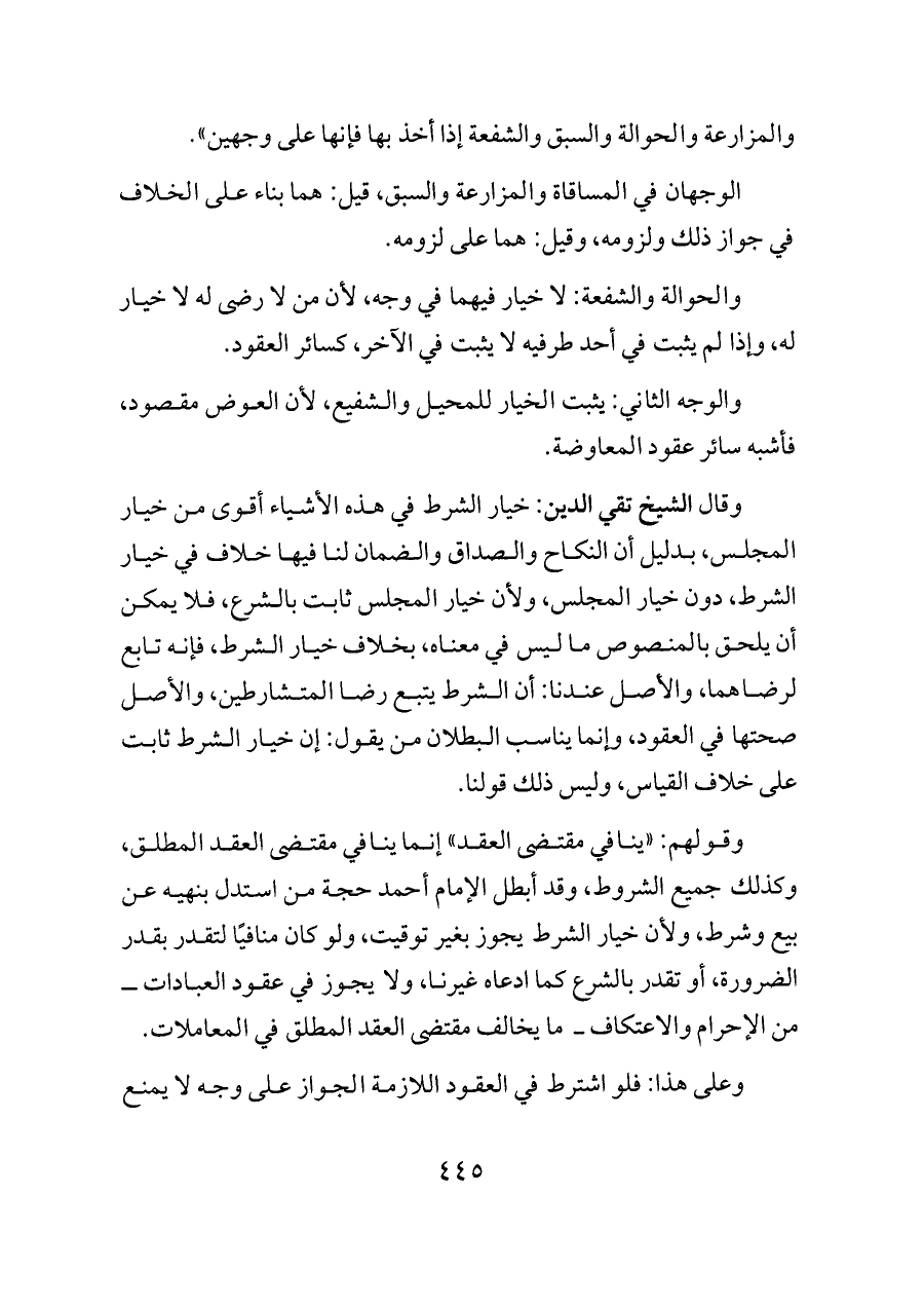 وقولهم: «ينافي مقتضى العقد» إنما ينافي مقتضى العقد المطلق، وكذلك جميع الشروط، وقد أبطل الإمام أحمد حجة من استدل بنهيه عن بيع وشرط، ولأن خيار الشرط يجوز بغير توقيت، ولو كان منافيًا لتقدر بقدر الضرورة، أو تقدر بالشرع كما ادعاه غيرنا، ولا يجوز في عقود العبادات ــ من الإحرام والاعتكاف ــ ما يخالف مقتضى العقد المطلق في المعاملات.