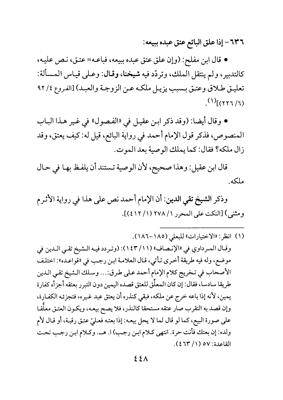 وقال المرداوي في «الإنصاف» (١١/ ١٤٣): (وتردد فيه الشيخ تقي الدين في موضع، وله فيه طريقة أخرى تأتي، قال العلامة ابن رجب في «قواعده»: اختلف الأصحاب في تخريج كلام الإمام أحمد على طرق: ... وسلك الشيخ تقي الدين طريقا سادسا، فقال: إن كان المعلِّق للعتق قصده اليمين دون التبرر بعتقه أجزأه كفارة يمين، لأنه إذا باعه خرج عن ملكه، فبقي كنذره أن يعتق عبد غيره، فتجزئه الكفارة، وإن قصد به التقرب صار عتقه مستحقا كالنذر، فلا يصح بيعه، ويكون العتق معلًّقا على صورة البيع، كما لو قال لما لا يحل بيعه: إذا بعته فعليّ عتق رقبة، أو قال لأم ولده: إن بعتك فأنت حرة. انتهى كلام ابن رجب) ا. هـ. وكلام ابن رجب تحت القاعدة: ٥٧ (١/ ٤٦٣).