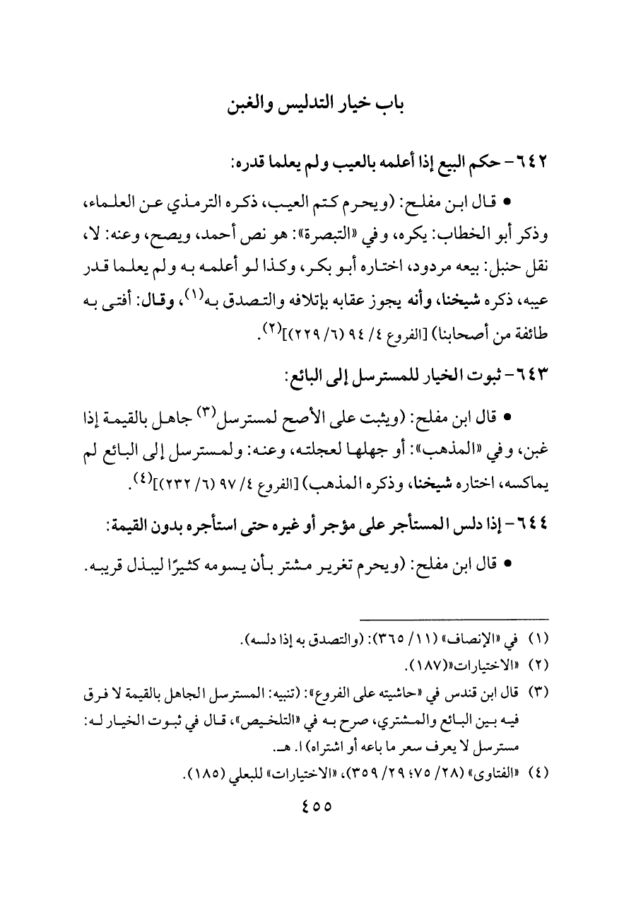 (¬٣) قال ابن قندس في «حاشيته على الفروع»: (تنبيه: المسترسل الجاهل بالقيمة لا فرق فيه بين البائع والمشتري، صرح به في «التلخيص»، قال في ثبوت الخيار له: مسترسل لا يعرف سعر ما باعه أو اشتراه) ا. هـ.