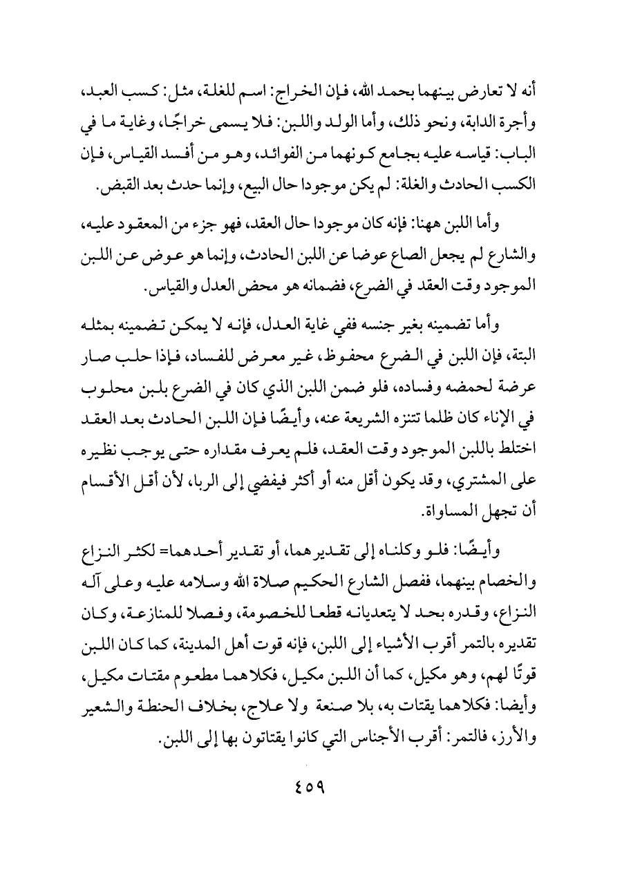 وأيضًا: فلو وكلناه إلى تقديرهما، أو تقدير أحدهما= لكثر النزاع والخصام بينهما، ففصل الشارع الحكيم صلاة الله وسلامه عليه وعلى آله النزاع، وقدره بحد لا يتعديانه قطعا للخصومة، وفصلا للمنازعة، وكان تقديره بالتمر أقرب الأشياء إلى اللبن، فإنه قوت أهل المدينة، كما كان اللبن قوتًا لهم، وهو مكيل، كما أن اللبن مكيل، فكلاهما مطعوم مقتات مكيل، وأيضا: فكلاهما يقتات به، بلا صنعة ولا علاج، بخلاف الحنطة والشعير والأرز، فالتمر: أقرب الأجناس التي كانوا يقتاتون بها إلى اللبن.