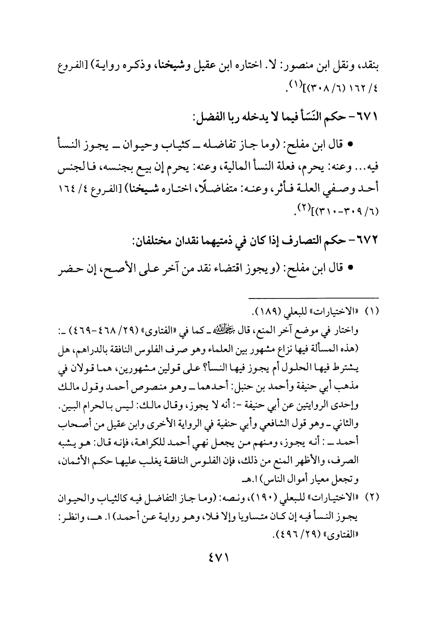 (¬٢) «الاختيارات» للبعلي (١٩٠)، ونصه: (وما جاز التفاضل فيه كالثياب والحيوان يجوز النسأ فيه إن كان متساويا وإلا فلا، وهو رواية عن أحمد) ا. هـ، وانظر: «الفتاوى» (٢٩/ ٤٩٦).