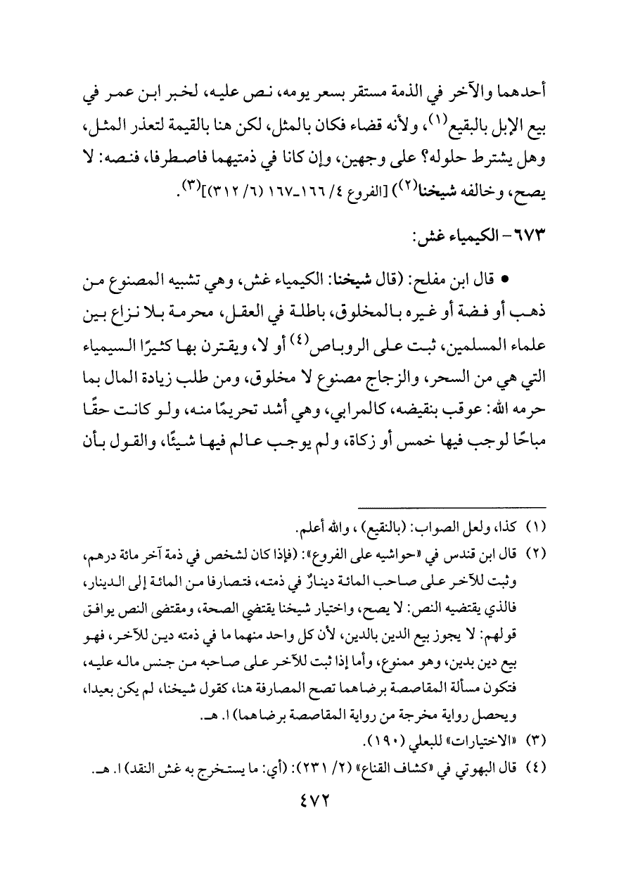 - قال ابن مفلح: (قال شيخنا: الكيمياء غش، وهي تشبيه المصنوع من ذهب أو فضة أو غيره بالمخلوق، باطلة في العقل، محرمة بلا نزاع بين علماء المسلمين، ثبت على الروباص (¬٤) أو لا، ويقترن بها كثيرًا السيمياء التي هي من السحر، والزجاج مصنوع لا مخلوق، ومن طلب زيادة المال بما حرمه الله: عوقب بنقيضه، كالمرابي، وهي أشد تحريمًا منه، ولو كانت حقًا مباحًا لوجب فيها خمس أو زكاة، ولم يوجب عالم فيها شيئًا، والقول بأن