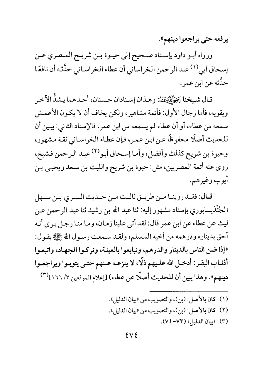قال: فقد روينا من طريق ثالث من حديث السري بن سهل الجُنْدَيسابوري بإسناد مشهور إليه: ثنا عبد الله بن رشيد ثنا عبد الرحمن عن ليث عن عطاء عن ابن عمر قال: لقد أتى علينا زمان، وما منا رجل يرى أنه أحق بديناره ودرهمه من أخيه المسلم، ولقد سمعت رسول الله - صلى الله عليه وسلم - يقول: «إذا ضن الناس بالدينار والدرهم، وتبايعوا بالعينة، وتركوا الجهاد، واتبعوا أذناب البقر: أدخل الله عليهم ذلًا، لا ينزعه عنهم حتى يتوبوا ويراجعوا دينهم». وهذا يبين أن للحديث أصلًا عن عطاء) [إعلام الموقعين ٣/ ١٦٦] (¬٣).