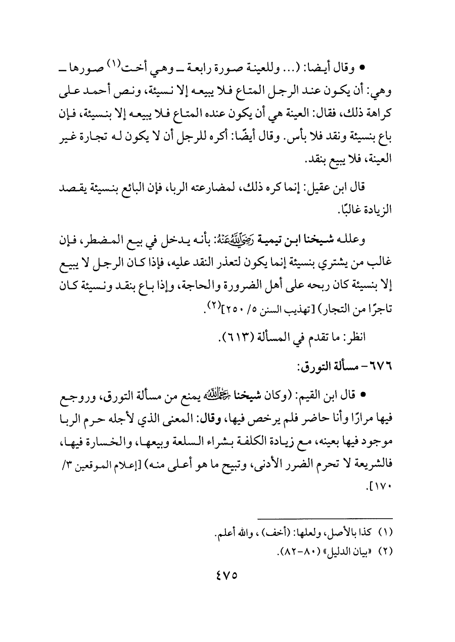 - قال ابن القيم: (وكان شيخنا - رحمه الله - يمنع من مسألة التورق، وروجع فيها مرارًا وأنا حاضر فلم يرخص فيها، وقال: المعنى الذي لأجله حرم الربا موجود فيها بعينه، مع زيادة الكلفة بشراء السلعة وبيعها، والخسارة فيها، فالشريعة لا تحرم الضرر الأدنى، وتبيح ما هو أعلى منه) [إعلام الموقعين ٣/ ١٧٠].