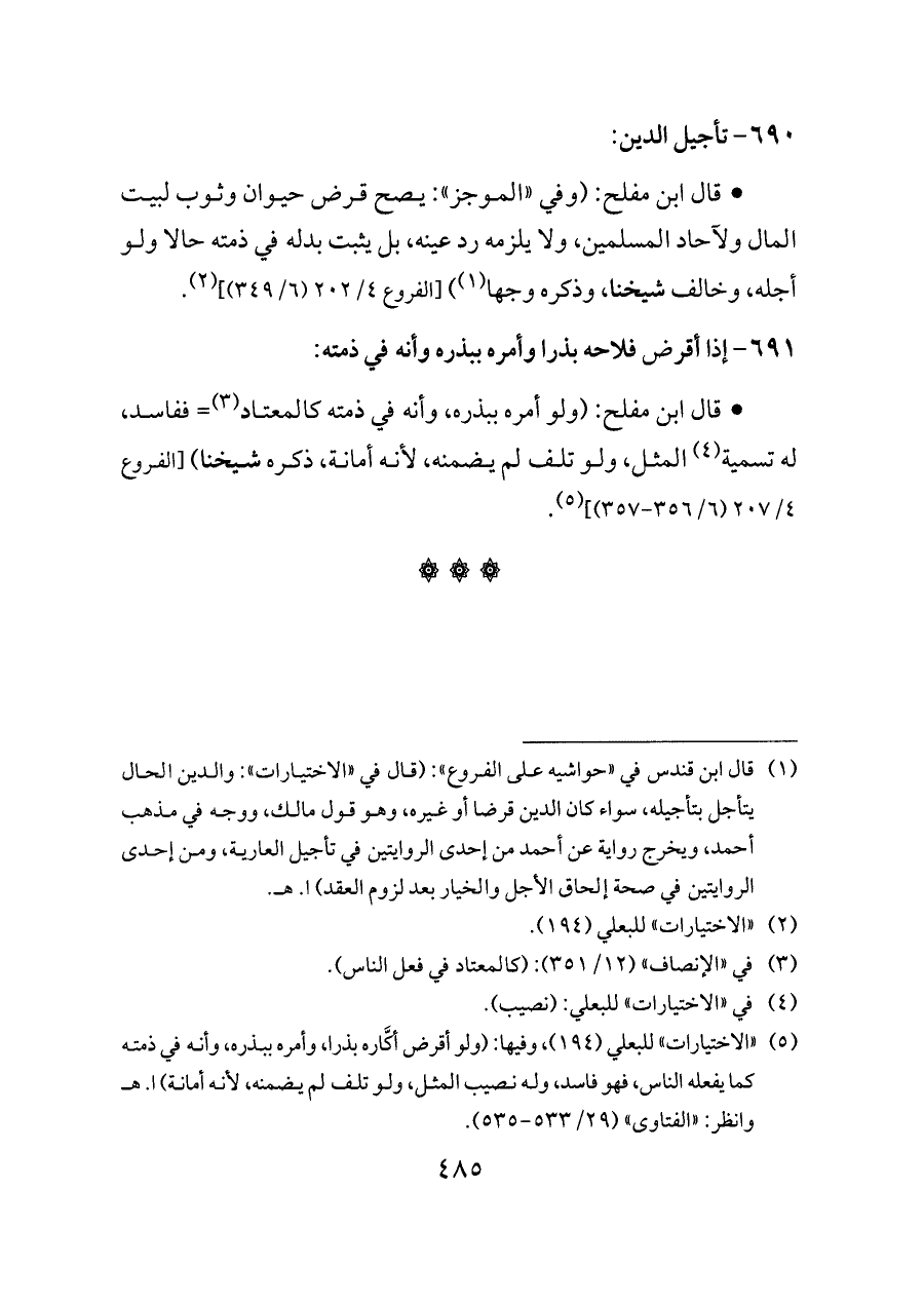(¬١) قال ابن قندس في «حواشيه على الفروع»: (قال في «الاختيارات»: والدين الحال يتأجل بتأجيله، سواء كان الدين قرضا أو غيره، وهو قول مالك، ووجه في مذهب أحمد، ويخرج رواية عن أحمد من إحدى الروايتين في تأجيل العارية، ومن إحدى الروايتين في صحة إلحاق الأجل والخيار بعد لزوم العقد) ا. هـ.
