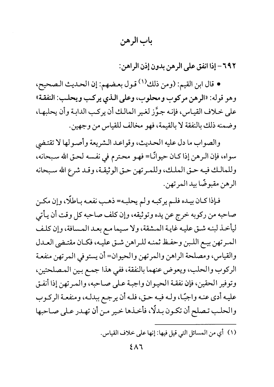 - قال ابن القيم: (ومن ذلك (¬١) قول بعضهم: إن الحديث الصحيح، وهو قوله: «الرهن مركوب ومحلوب، وعلى الذي يركب ويحلب: النفقة» على خلاف القياس، فإنه جوَّز لغير المالك أن يركب الدابة وأن يحلبها، وضمنه ذلك بالنفقة لا بالقيمة، فهو مخالف للقياس من وجهين.