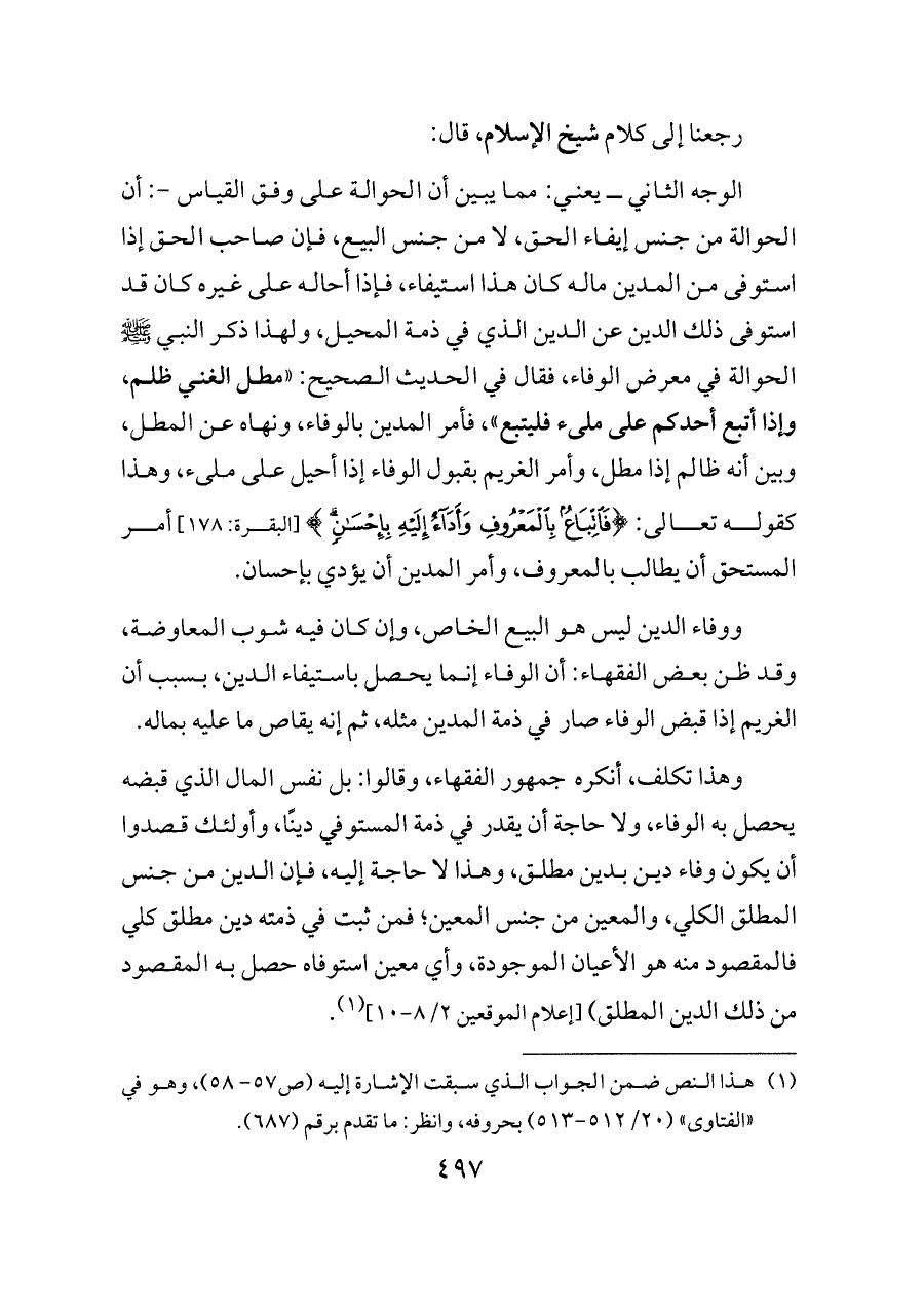 الوجه الثاني ــ يعني: مما يبين أن الحوالة على وفق القياس -: أن الحوالة من جنس إيفاء الحق، لا من جنس البيع، فإن صاحب الحق إذا استوفى من المدين ماله كان هذا استيفاء، فإذا أحاله على غيره كان قد استوفى ذلك الدين عن الدين الذي في ذمة المحيل، ولهذا ذكر النبي - صلى الله عليه وسلم - الحوالة في معرض الوفاء، فقال في الحديث الصحيح: «مطل الغني ظلم، وإذا أتبع أحدكم على ملئ فليتبع»، فأمر المدين بالوفاء، ونهاه عن المطل، وبين أنه ظالم إذا مطل، وأمر الغريم بقبول الوفاء إذا أحيل على ملئ، وهذا كقوله تعالى: {فَاتِّبَاعٌ بِالْمَعْرُوفِ وَأَدَاءٌ إِلَيْهِ بِإِحْسَانٍ} [البقرة: ١٧٨] أمر المستحق أن يطالب بالمعروف، وأمر المدين أن يؤدي بإحسان.