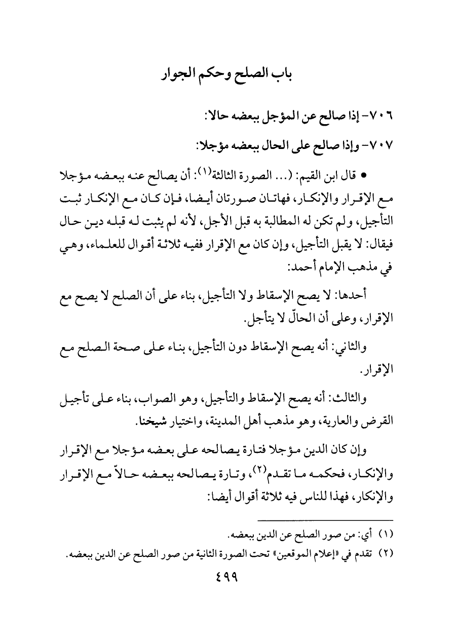 - قال ابن القيم: ( ... الصورة الثالثة (¬١): أن يصالح عنه ببعضه مؤجلا مع الإقرار والإنكار، فهاتان صورتان أيضا، فإن كان مع الإنكار ثبت التأجيل، ولم تكن له المطالبة به قبل الأجل، لأنه لم يثبت له قبله دين حال فيقال: لا يقبل التأجيل، وإن كان مع الإقرار ففيه ثلاثة أقوال للعلماء، وهي في مذهب الإمام أحمد: