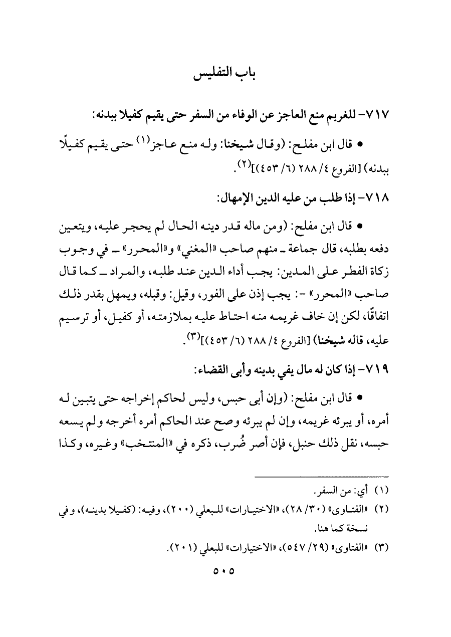 - قال ابن مفلح: (وقال شيخنا: وله منع عاجز (¬١) حتى يقيم كفيلًا ببدنه) [الفروع ٤/ ٢٨٨ (٦/ ٤٥٣)] (¬٢).