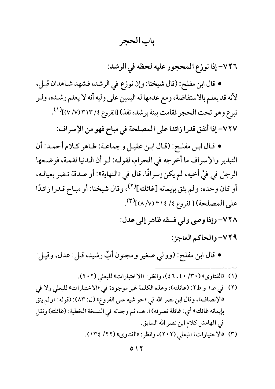 (¬٢) في ط ١ وط ٢: (عائلته)، وهذه الكلمة غير موجودة في «الاختيارات» للبعلي ولا في «الإنصاف» , وقال ابن نصر الله في «حواشيه على الفروع» (ل: ٨٣): (قوله: «ولم يثق بإيمانه غائلته» أي: غائلة تصرفه) ا. هـ، ثم وجدته في النسخة الخطية: (غائلته) ونقل في الهامش كلام ابن نصر الله السابق.