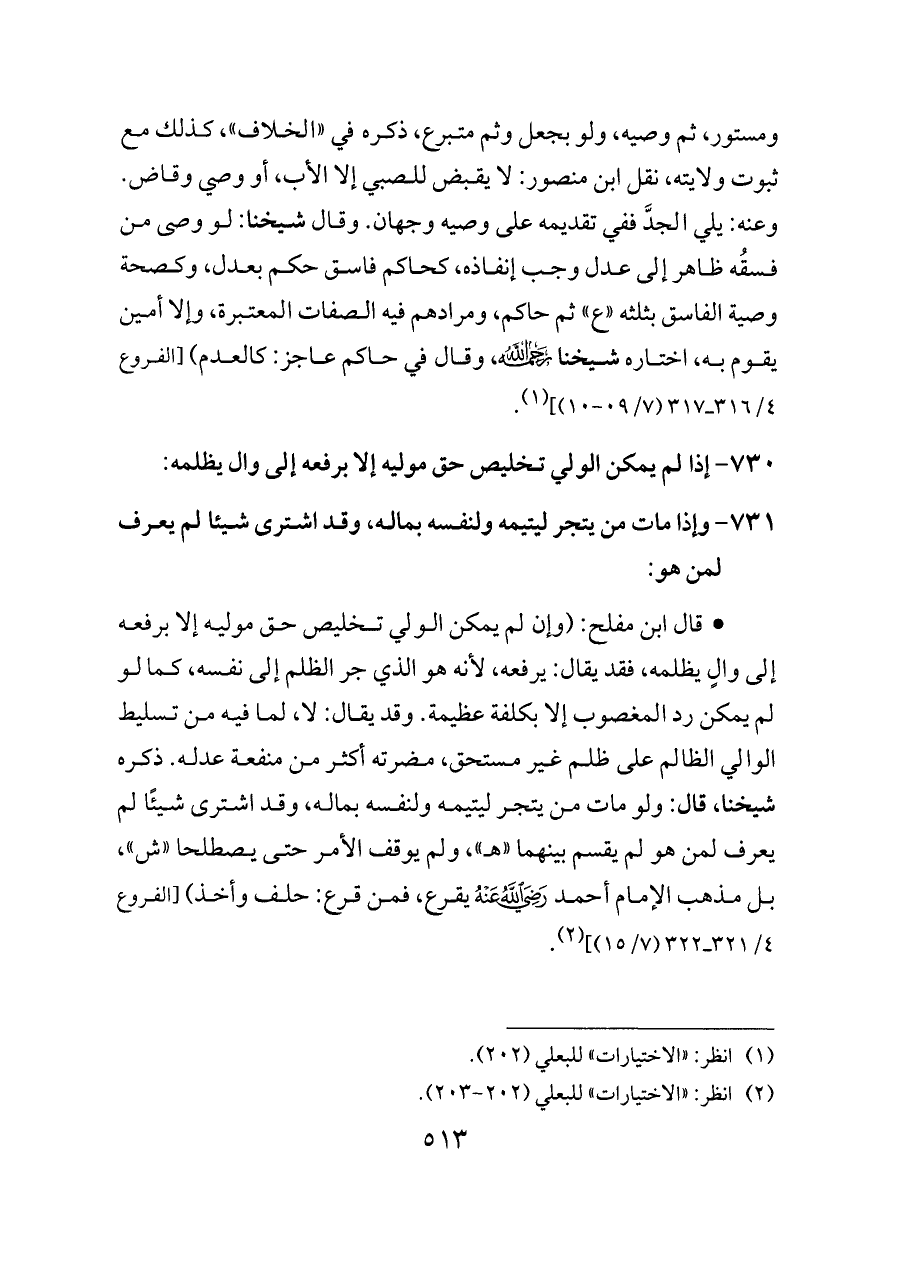 - قال ابن مفلح: (وإن لم يمكن الولي تخليص حق موليه إلا برفعه إلى والٍ يظلمه، فقد يقال: يرفعه، لأنه هو الذي جر الظلم إلى نفسه، كما لو لم يمكن رد المغصوب إلا بكلفة عظيمة. وقد يقال: لا، لما فيه من تسليط الوالي الظالم على ظلم غير مستحق، مضرته أكثر من منفعة عدله. ذكره شيخنا، قال: ولو مات من يتجر ليتيمه ولنفسه بماله، وقد اشترى شيئًا لم يعرف لمن هو لم يقسم بينهما «هـ»، ولم يوقف الأمر حتى يصطلحا «ش»، بل مذهب الإمام أحمد - رضي الله عنه - يقرع، فمن قرع: حلف وأخذ) [الفروع ٤/ ٣٢١ ــ ٣٢٢ (٧/ ١٥)] (¬٢).