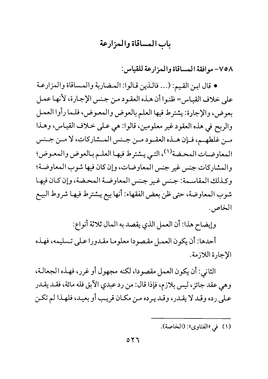 ٧٥٨ - موافقة المساقاة والمزارعة للقياس: