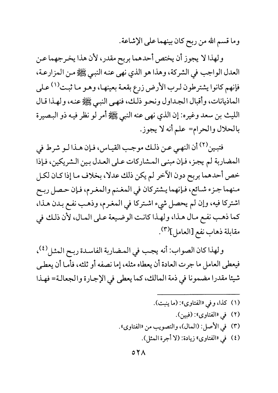 ولهذا لا يجوز أن يختص أحدهما بربح مقدر، لأن هذا يخرجهما عن العدل الواجب في الشركة، وهذا هو الذي نهى عنه النبي - صلى الله عليه وسلم - من المزارعة، فإنهم كانوا يشترطون لرب الأرض زرع بقعة بعينها، وهو ما ثبت (¬١) على الماذيانات، وأقبال الجداول ونحو ذلك، فنهى النبي - صلى الله عليه وسلم - عنه، ولهذا قال الليث بن سعد وغيره: إن الذي نهى عنه النبي - صلى الله عليه وسلم - أمر لو نظر فيه ذو البصيرة بالحلال والحرام= علم أنه لا يجوز.