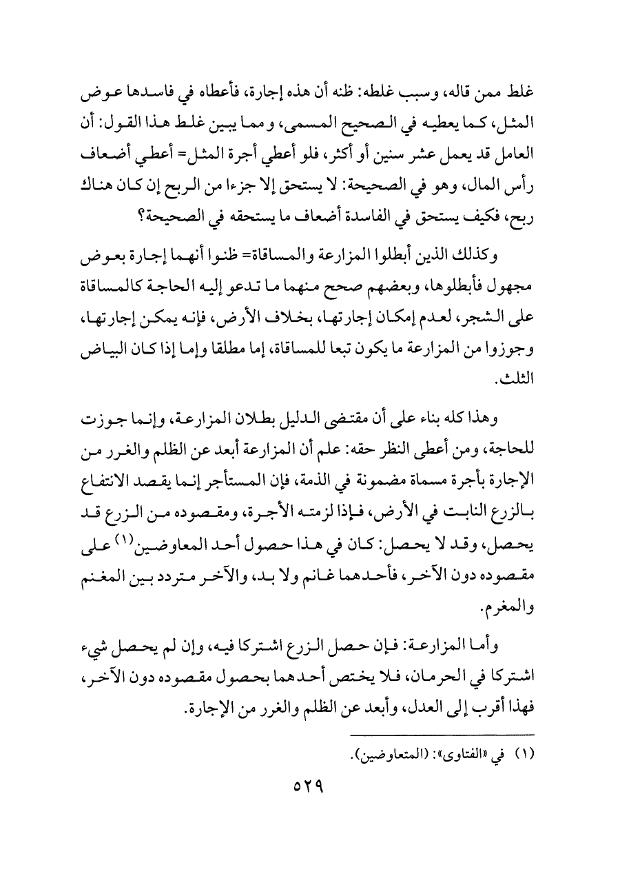 وكذلك الذين أبطلوا المزارعة والمساقاة= ظنوا أنهما إجارة بعوض مجهول فأبطلوها، وبعضهم صحح منهما ما تدعو إليه الحاجة كالمساقاة على الشجر، لعدم إمكان إجارتها، بخلاف الأرض، فإنه يمكن إجارتها، وجوزوا من المزارعة ما يكون تبعا للمساقاة، إما مطلقا وإما إذا كان البياض الثلث.