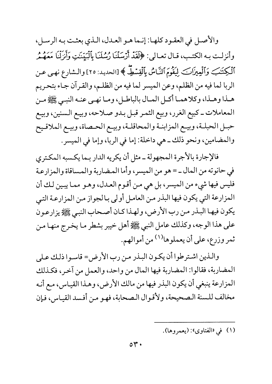 فالإجارة بالأجرة المجهولة ــ مثل أن يكريه الدار بما يكسبه المكتري في حانوته من المال ــ = هو من الميسر، وأما المضاربة والمساقاة والمزارعة فليس فيها شيء من الميسر، بل هي من أقوم العدل، وهو مما يبين لك أن المزارعة التي يكون فيها البذر من العامل أولى بالجواز من المزارعة التي يكون فيها البذر من رب الأرض، ولهذا كان أصحاب النبي - صلى الله عليه وسلم - يزارعون على هذا الوجه، وكذلك عامل النبي - صلى الله عليه وسلم - أهل خيبر بشطر ما يخرج منها من ثمر وزرع، على أن يعملوها (¬١) من أموالهم.