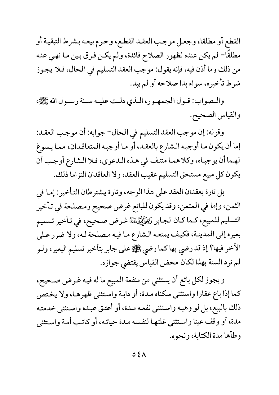 وقوله: إن موجب العقد التسليم في الحال= جوابه: أن موجب العقد: إما أن يكون ما أوجبه الشارع بالعقد، أو ما أوجبه المتعاقدان، مما يسوغ لهما أن يوجباه، وكلاهما منتف في هذه الدعوى، فلا الشارع أوجب أن يكون كل مبيع مستحق التسليم عقيب العقد، ولا العاقدان التزاما ذلك.