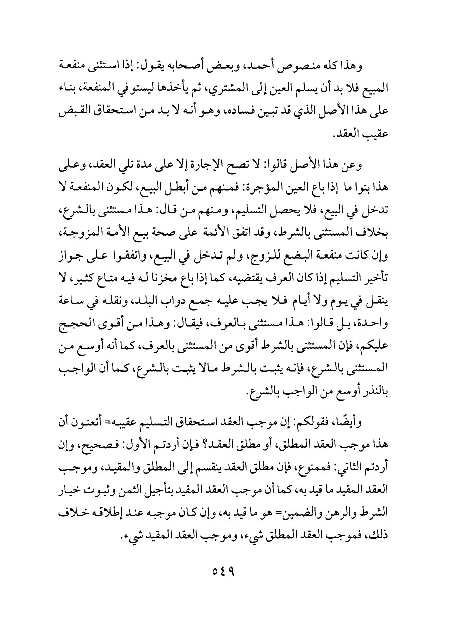 وأيضًا، فقولكم: إن موجب العقد استحقاق التسليم عقيبه= أتعنون أن هذا موجب العقد المطلق، أو مطلق العقد؟ فإن أردتم الأول: فصحيح، وإن أردتم الثاني: فممنوع، فإن مطلق العقد ينقسم إلى المطلق والمقيد، وموجب العقد المقيد ما قيد به، كما أن موجب العقد المقيد بتأجيل الثمن وثبوت خيار الشرط والرهن والضمين= هو ما قيد به، وإن كان موجبه عند إطلاقه خلاف ذلك، فموجب العقد المطلق شيء، وموجب العقد المقيد شيء.