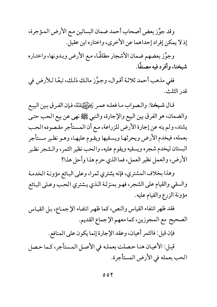 وقد جوَّز بعض أصحاب أحمد ضمان البساتين مع الأرض المؤجرة، إذ لا يمكن إفراد إحداهما عن الأخرى، واختاره ابن عقيل.
