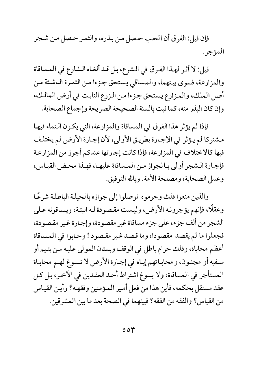 والذين منعوا ذلك وحرموه توصلوا إلى جوازه بالحيلة الباطلة شرعًا وعقلًا، فإنهم يؤجرونه الأرض، وليست مقصودة له البتة، ويساقونه على الشجر من ألف جزء، على جزء مساقاة غير مقصودة، وإجارة غير مقصودة، فجعلوا ما لم يقصد مقصودا، وما قصد غير مقصود! وحابوا في المساقاة أعظم محاباة، وذلك حرام باطل في الوقف وبستان المولى عليه من يتيم أو سفيه أو مجنون، ومحاباتهم إياه في إجارة الأرض لا تسوغ لهم محاباة المستأجر في المساقاة، ولا يسوغ اشتراط أحد العقدين في الآخر، بل كل عقد مستقل بحكمه، فأين هذا من فعل أمير المؤمنين وفقهه؟ وأين القياس من القياس؟ والفقه من الفقه؟ فبينهما في الصحة بعد ما بين المشرقين.