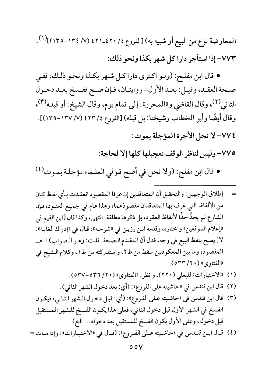 (¬٤) قال ابن قندس في «حاشيته على الفروع»: (قال في «الاختيارات»: وإذا مات المستأجر لم يلزم ورثته تعجيل الأجرة في أصح قولي العلماء. وهذا على قول من يقول: لا يحل الدين بالموت ظاهر، وكذلك على قول من يقول بحلوله في أظهر قوليهم، إذ يفرقون بين الإجارة وغيرها، كما يفرقون في الأرض المحتكرة إذا بيعت أو ورثت، فإن الحكر يكون على المشتري والوارث، وليس لأصحاب الحكر أخذ الحكر من البائع وتركة الميت في أظهر قولي العلماء، وهذا معنى قول المصنف: «وليس لهم أخذه من بائع وتركة») ا. هـ.
