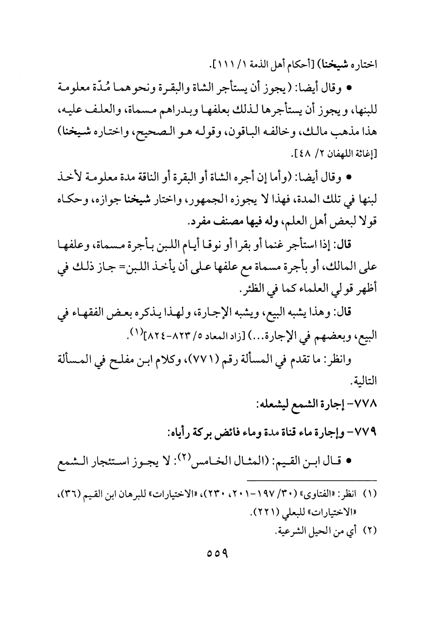 - وقال أيضا: (وأما إن أجره الشاة أو البقرة أو الناقة مدة معلومة لأخذ لبنها في تلك المدة، فهذا لا يجوزه الجمهور، واختار شيخنا جوازه، وحكاه قولا لبعض أهل العلم، وله فيها مصنف مفرد.
