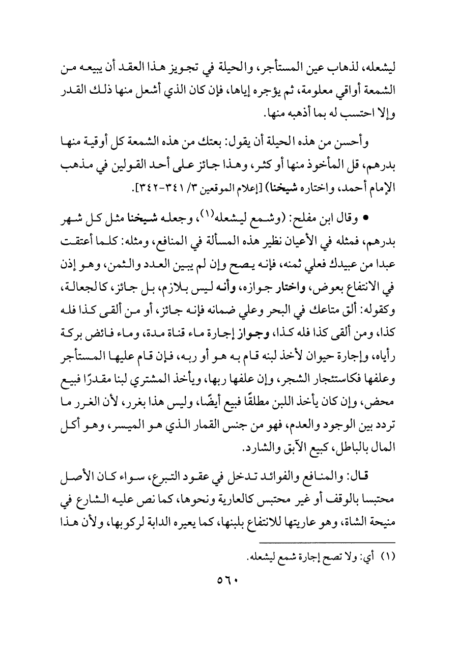 - وقال ابن مفلح: (وشمع ليشعله (¬١)، وجعله شيخنا مثل كل شهر بدرهم، فمثله في الأعيان نظير هذه المسألة في المنافع، ومثله: كلما أعتقت عبدا من عبيدك فعلي ثمنه، فإنه يصح وإن لم يبين العدد والثمن، وهو إذن في الانتفاع بعوض، واختار جوازه، وأنه ليس بلازم، بل جائز، كالجعالة، وكقوله: ألق متاعك في البحر وعلي ضمانه فإنه جائز، أو من ألقى كذا فله كذا، ومن ألقى كذا فله كذا، وجواز إجارة ماء قناة مدة، وماء فائض بركة رأياه، وإجارة حيوان لأخذ لبنه قام به هو أو ربه، فإن قام عليها المستأجر وعلفها فكاستئجار الشجر، وإن علفها ربها، ويأخذ المشتري لبنا مقدرًا فبيع محض، وإن كان يأخذ اللبن مطلقًا فبيع أيضًا، وليس هذا بغرر، لأن الغرر ما تردد بين الوجود والعدم، فهو من جنس القمار الذي هو الميسر، وهو أكل المال بالباطل، كبيع الآبق والشارد.
