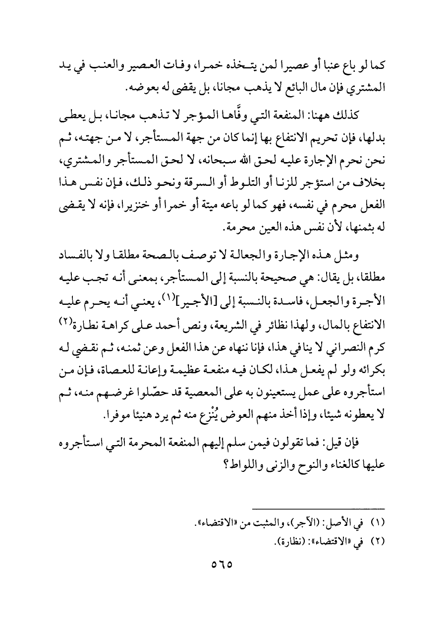 ومثل هذه الإجارة والجعالة لا توصف بالصحة مطلقا ولا بالفساد مطلقا، بل يقال: هي صحيحة بالنسبة إلى المستأجر، بمعنى أنه تجب عليه الأجرة والجعل، فاسدة بالنسبة إلى [الأجير] (¬١)، يعني أنه يحرم عليه الانتفاع بالمال، ولهذا نظائر في الشريعة، ونص أحمد على كراهة نطارة (¬٢) كرم النصراني لا ينافي هذا، فإنا ننهاه عن هذا الفعل وعن ثمنه، ثم نقضي له بكرائه ولو لم يفعل هذا، لكان فيه منفعة عظيمة وإعانة للعصاة، فإن من استأجروه على عمل يستعينون به على المعصية قد حصّلوا غرضهم منه، ثم لا يعطونه شيئا، وإذا أخذ منهم العوض يُنْزع منه ثم يرد هنيئا موفرا.