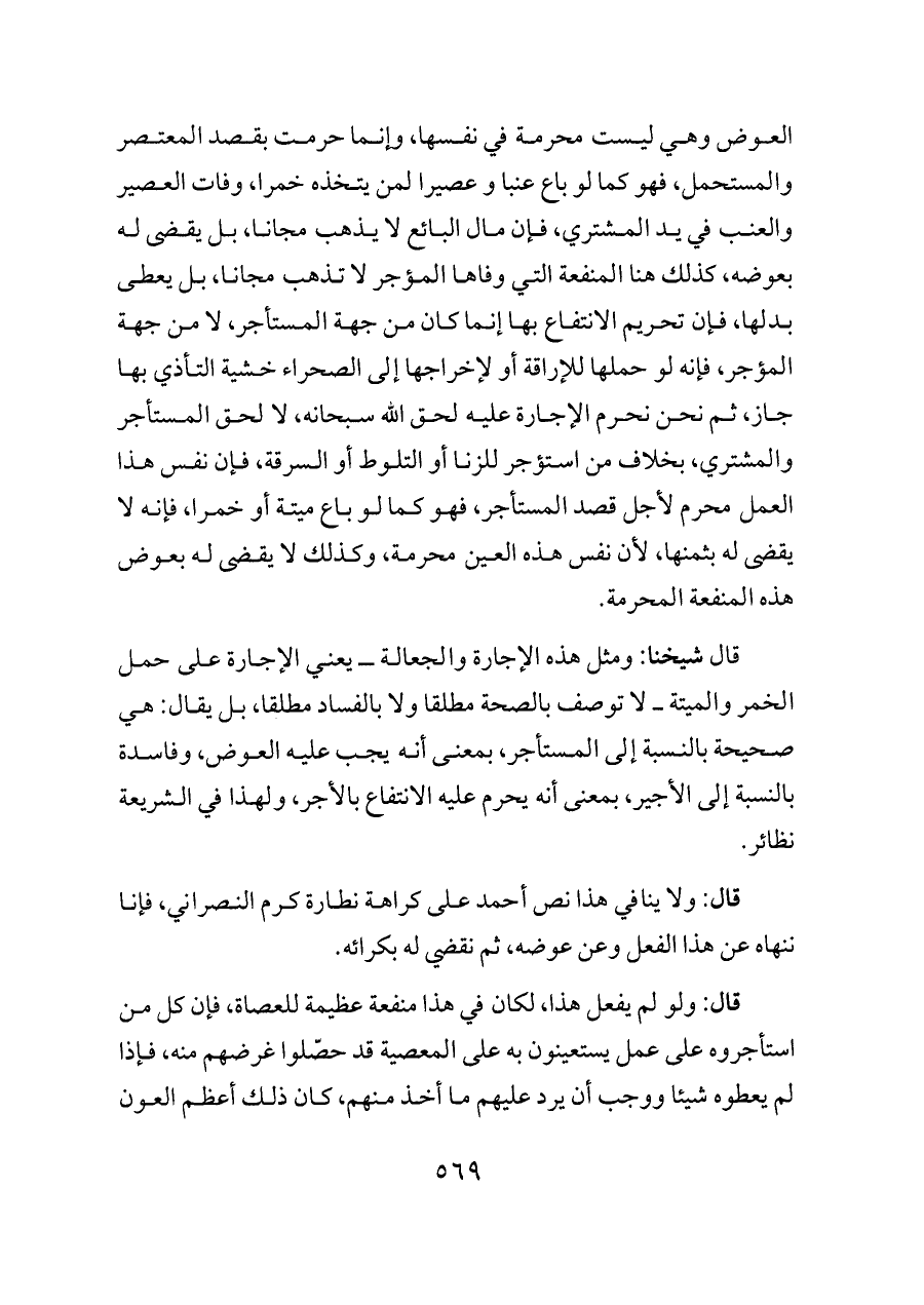 قال شيخنا: ومثل هذه الإجارة والجعالة ــ يعني الإجارة على حمل الخمر والميتة ــ لا توصف بالصحة مطلقا ولا بالفساد مطلقا، بل يقال: هي صحيحة بالنسبة إلى المستأجر، بمعنى أنه يجب عليه العوض، وفاسدة بالنسبة إلى الأجير، بمعنى أنه يحرم عليه الانتفاع بالأجر، ولهذا في الشريعة نظائر.