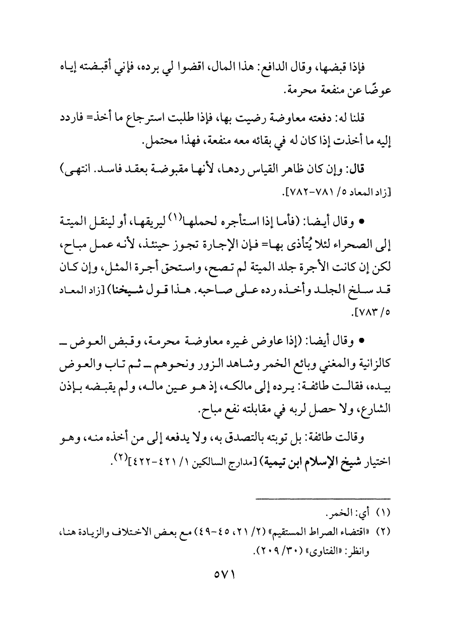 - وقال أيضا: (إذا عاوض غيره معاوضة محرمة، وقبض العوض ــ كالزانية والمغني وبائع الخمر وشاهد الزور ونحوهم ــ ثم تاب والعوض بيده، فقالت طائفة: يرده إلى مالكه، إذ هو عين ماله، ولم يقبضه بإذن الشارع، ولا حصل لربه في مقابلته نفع مباح.