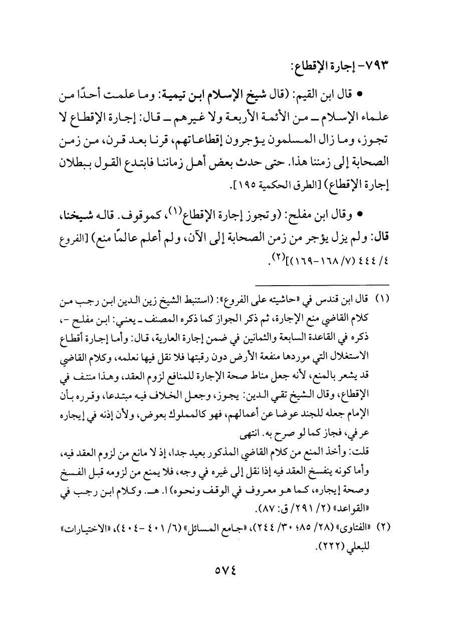 - قال ابن القيم: (قال شيخ الإسلام ابن تيمية: وما علمت أحدًا من علماء الإسلام ــ من الأئمة الأربعة ولا غيرهم ــ قال: إجارة الإقطاع لا تجوز، وما زال المسلمون يؤجرون إقطاعاتهم، قرنا بعد قرن، من زمن الصحابة إلى زمننا هذا. حتى حدث بعض أهل زماننا فابتدع القول ببطلان إجارة الإقطاع) [الطرق الحكمية ١٩٥].