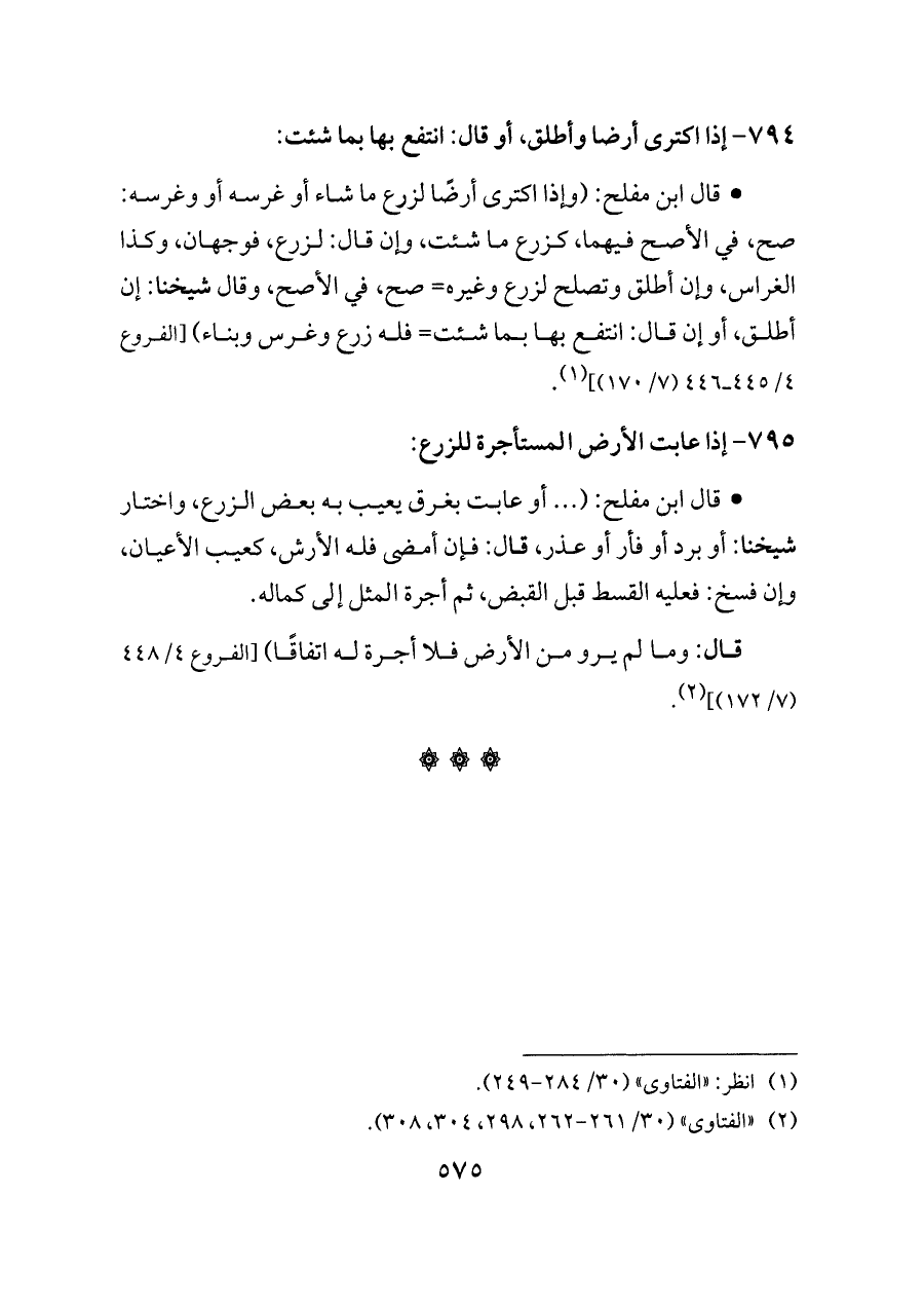 - قال ابن مفلح: (وإذا اكترى أرضًا لزرع ما شاء أو غرسه أو وغرسه: صح، في الأصح فيهما، كزرع ما شئت، وإن قال: لزرع، فوجهان، وكذا الغراس، وإن أطلق وتصلح لزرع وغيره= صح، في الأصح، وقال شيخنا: إن أطلق، أو إن قال: انتفع بها بما شئت= فله زرع وغرس وبناء) [الفروع ٤/ ٤٤٥ ــ ٤٤٦ (٧/ ١٧٠)] (¬١).