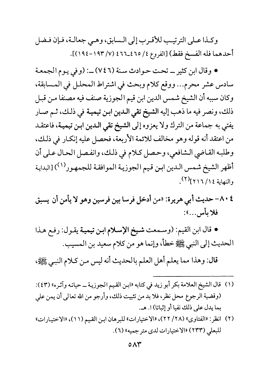 - وقال ابن كثير ــ تحت حوادث سنة (٧٤٦) ــ: (وفي يوم الجمعة سادس عشر محرم ... ووقع كلام وبحث في اشتراط المحلل في المسابقة، وكان سببه أن الشيخ شمس الدين ابن قيم الجوزية صنف فيه مصنفا من قبل ذلك، ونصر فيه ما ذهب إليه الشيخ تقي الدين ابن تيمية في ذلك، ثم صار يفتي به جماعة من الترك ولا يعزوه إلى الشيخ تقي الدين ابن تيمية، فاعتقد من اعتقد أنه قوله وهو مخالف للائمة الأربعة، فحصل عليه إنكار في ذلك، وطلبه القاضي الشافعي، وحصل كلام في ذلك، وانفصل الحال على أن أظهر الشيخ شمس الدين ابن قيم الجوزية الموافقة للجمهور (¬١)) [البداية والنهاية ١٤/ ٢١٦] (¬٢).