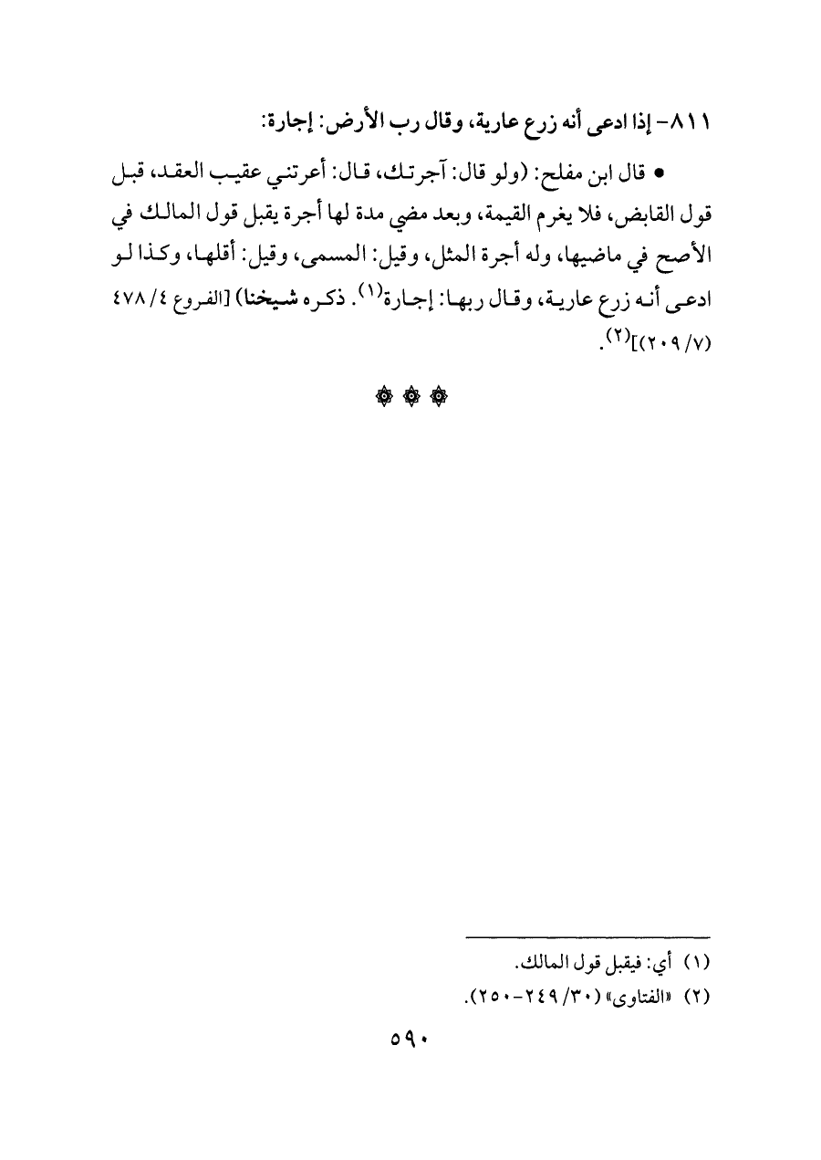 - قال ابن مفلح: (ولو قال: آجرتك، قال: أعرتني عقيب العقد، قبل قول القابض، فلا يغرم القيمة، وبعد مضي مدة لها أجرة يقبل قول المالك في الأصح في ماضيها، وله أجرة المثل، وقيل: المسمى، وقيل: أقلها، وكذا لو ادعى أنه زرع عارية، وقال ربها: إجارة (¬١). ذكره شيخنا) [الفروع ٤/ ٤٧٨ (٧/ ٢٠٩)] (¬٢).
