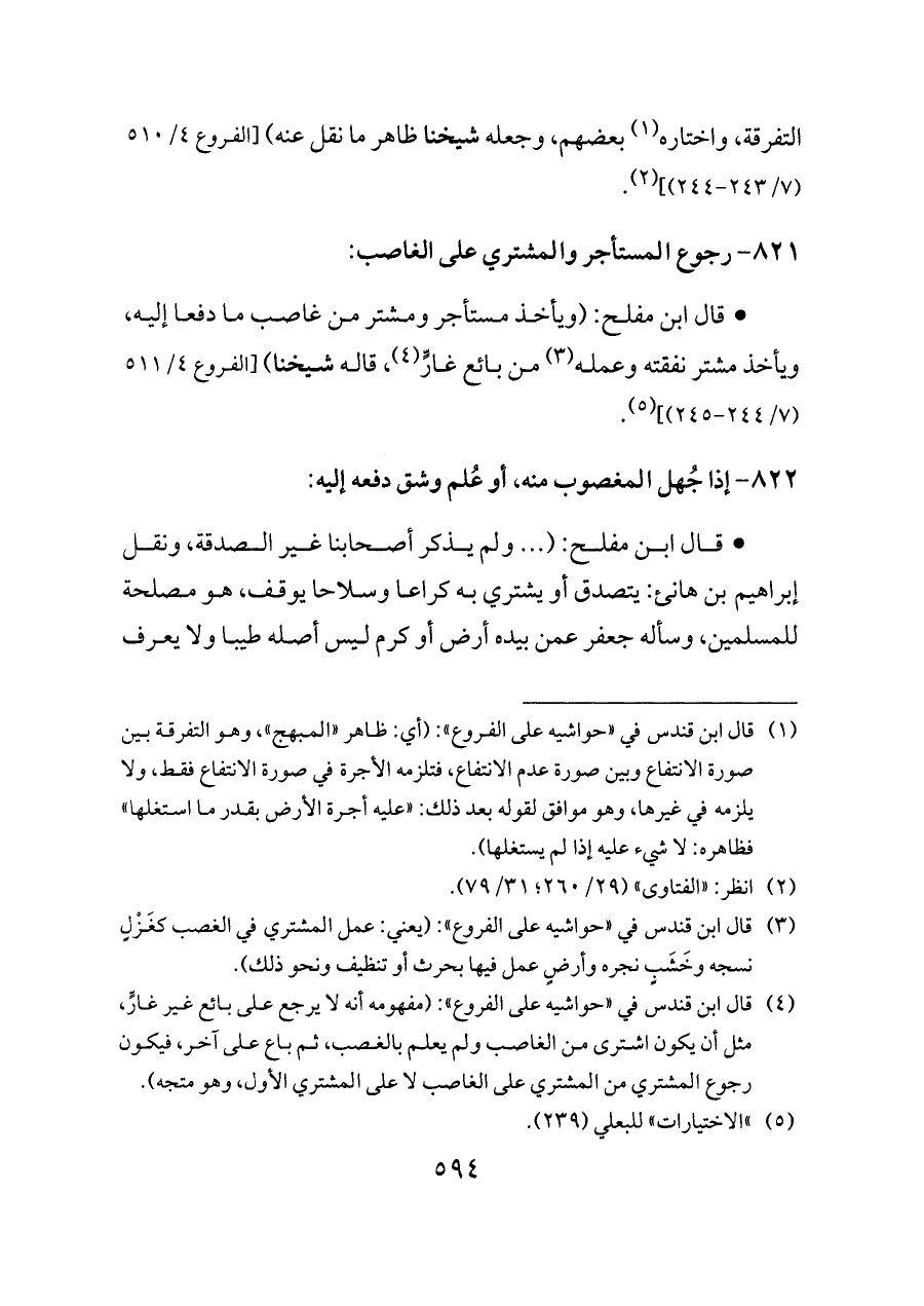 (¬٤) قال ابن قندس في «حواشيه على الفروع»: (مفهومه أنه لا يرجع على بائع غير غارٍّ، مثل أن يكون اشترى من الغاصب ولم يعلم بالغصب، ثم باع على آخر، فيكون رجوع المشتري من المشتري على الغاصب لا على المشتري الأول، وهو متجه).