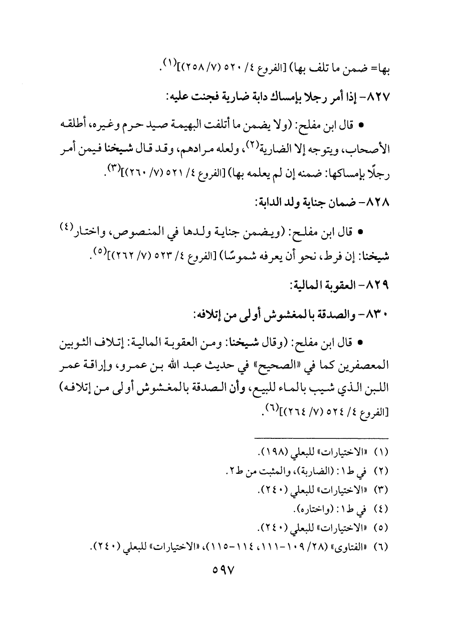 - قال ابن مفلح: (ويضمن جناية ولدها في المنصوص، واختار (¬٤) شيخنا: إن فرط، نحو أن يعرفه شموسًا) [الفروع ٤/ ٥٢٣ (٧/ ٢٦٢)] (¬٥).