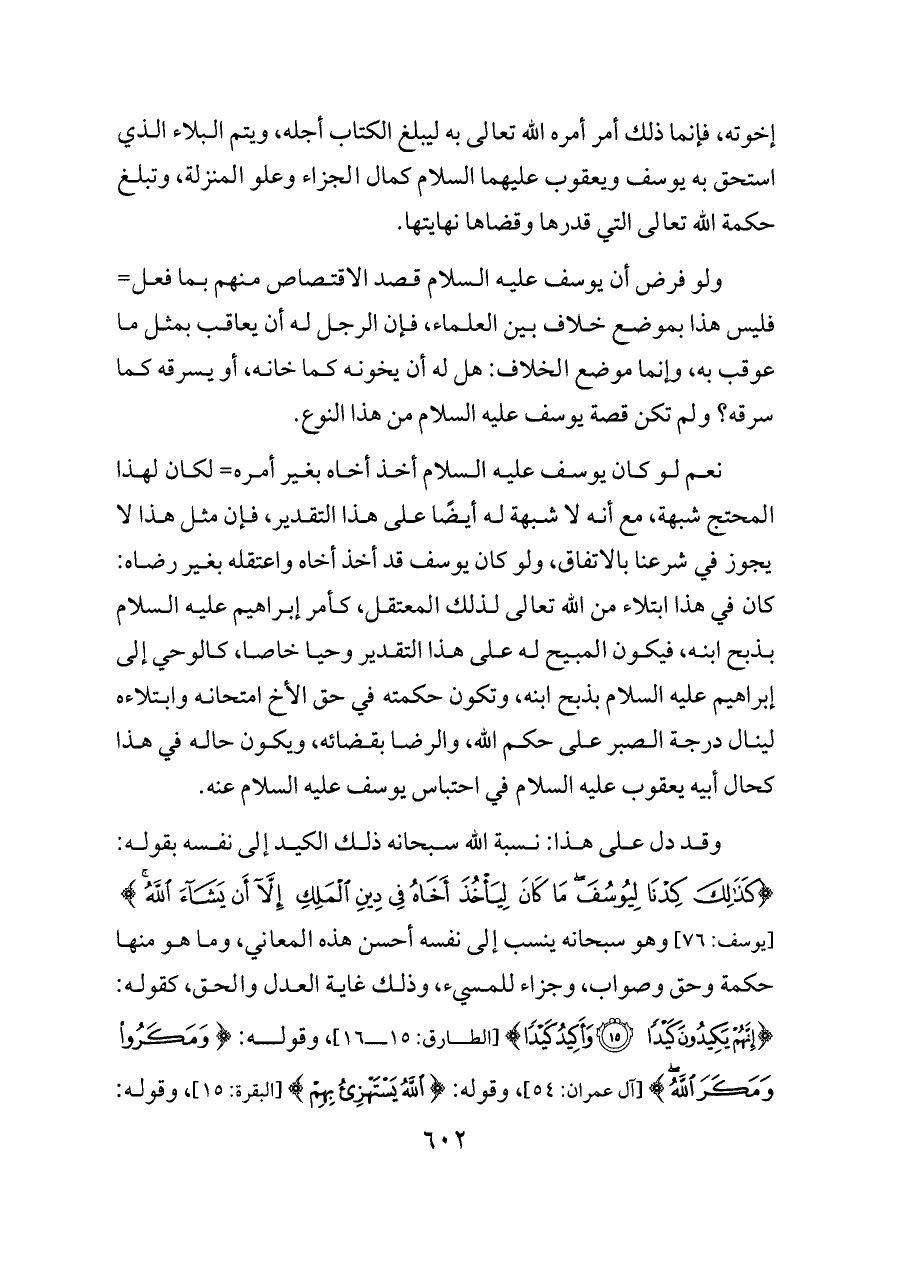 وقد دل على هذا: نسبة الله سبحانه ذلك الكيد إلى نفسه بقوله: {كَذَلِكَ كِدْنَا لِيُوسُفَ مَا كَانَ لِيَأْخُذَ أَخَاهُ فِي دِينِ الْمَلِكِ إِلَّا أَنْ يَشَاءَ اللَّهُ} [يوسف: ٧٦] وهو سبحانه ينسب إلى نفسه أحسن هذه المعاني، وما هو منها حكمة وحق وصواب، وجزاء للمسيء، وذلك غاية العدل والحق، كقوله: {إِنَّهُمْ يَكِيدُونَ كَيْدًا (١٥) وَأَكِيدُ كَيْدًا} [الطارق: ١٥ ـ ١٦]، وقوله: {وَمَكَرُوا وَمَكَرَ اللَّهُ} [آل عمران: ٥٤]، وقوله: {اللَّهُ يَسْتَهْزِئُ بِهِمْ} [البقرة: ١٥]، وقوله: