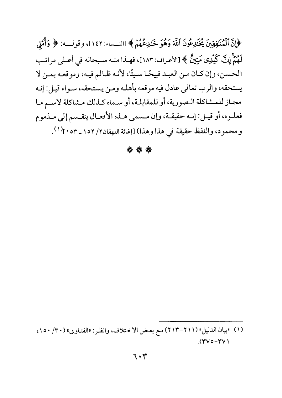 {إِنَّ الْمُنَافِقِينَ يُخَادِعُونَ اللَّهَ وَهُوَ خَادِعُهُمْ} [النساء: ١٤٢]، وقوله: {وَأُمْلِي لَهُمْ إِنَّ كَيْدِي مَتِينٌ} [الأعراف: ١٨٣]، فهذا منه سبحانه في أعلى مراتب الحسن، وإن كان من العبد قبيحًا سيئًا، لأنه ظالم فيه، وموقعه بمن لا يستحقه، والرب تعالى عادل فيه موقعه بأهله ومن يستحقه، سواء قيل: إنه مجاز للمشاكلة الصورية، أو للمقابلة، أو سماه كذلك مشاكلة لاسم ما فعلوه، أو قيل: إنه حقيقة، وإن مسمى هذه الأفعال ينقسم إلى مذموم ومحمود، واللفظ حقيقة في هذا وهذا) [إغاثة اللهفان ٢/ ١٥٢ ــ ١٥٣] (¬١).