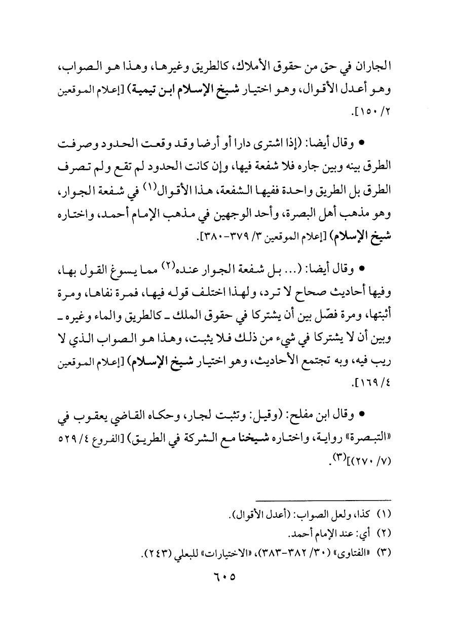 - وقال أيضا: (إذا اشترى دارا أو أرضا وقد وقعت الحدود وصرفت الطرق بينه وبين جاره فلا شفعة فيها، وإن كانت الحدود لم تقع ولم تصرف الطرق بل الطريق واحدة ففيها الشفعة، هذا الأقوال (¬١) في شفعة الجوار، وهو مذهب أهل البصرة، وأحد الوجهين في مذهب الإمام أحمد، واختاره شيخ الإسلام) [إعلام الموقعين ٣/ ٣٧٩ - ٣٨٠].