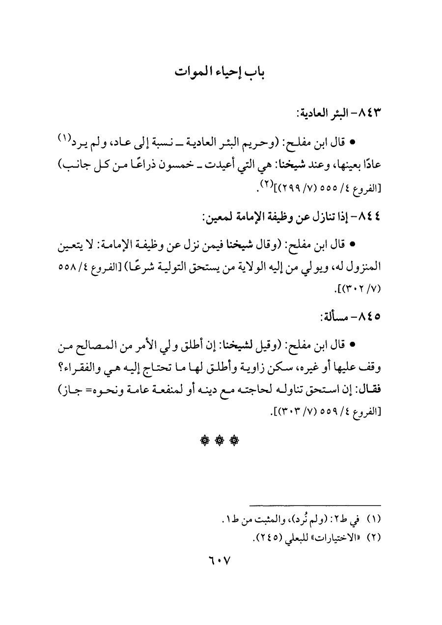 - قال ابن مفلح: (وحريم البئر العادية ــ نسبة إلى عاد، ولم يرد (¬١) عادًا بعينها، وعند شيخنا: هي التي أعيدت ــ خمسون ذراعًا من كل جانب) [الفروع ٤/ ٥٥٥ (٧/ ٢٩٩)] (¬٢).