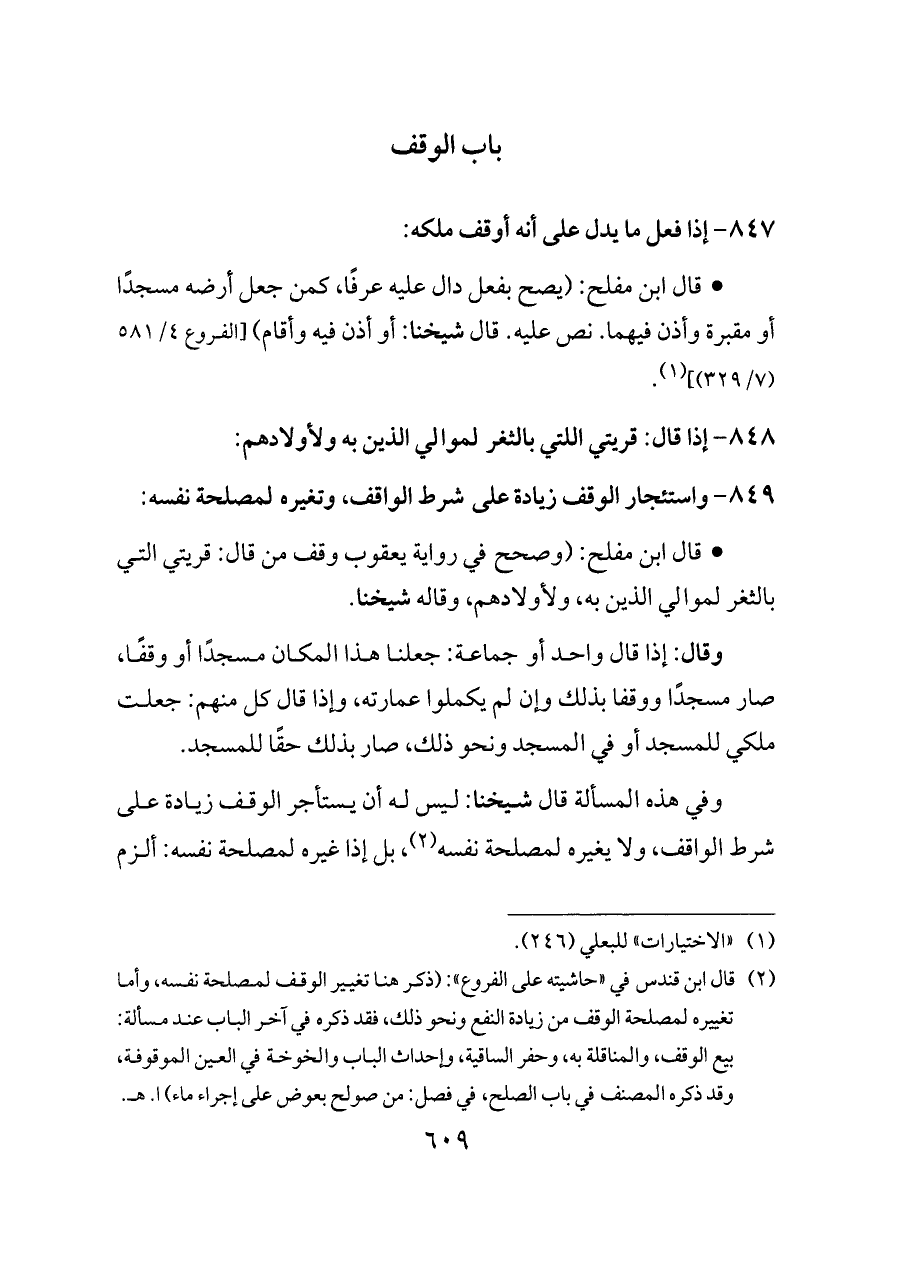 (¬٢) قال ابن قندس في «حاشيته على الفروع»: (ذكر هنا تغيير الوقف لمصلحة نفسه، وأما تغييره لمصلحة الوقف من زيادة النفع ونحو ذلك، فقد ذكره في آخر الباب عند مسألة: بيع الوقف، والمناقلة به، وحفر الساقية، وإحداث الباب والخوخة في العين الموقوفة، وقد ذكره المصنف في باب الصلح، في فصل: من صولح بعوض على إجراء ماء) ا. هـ.