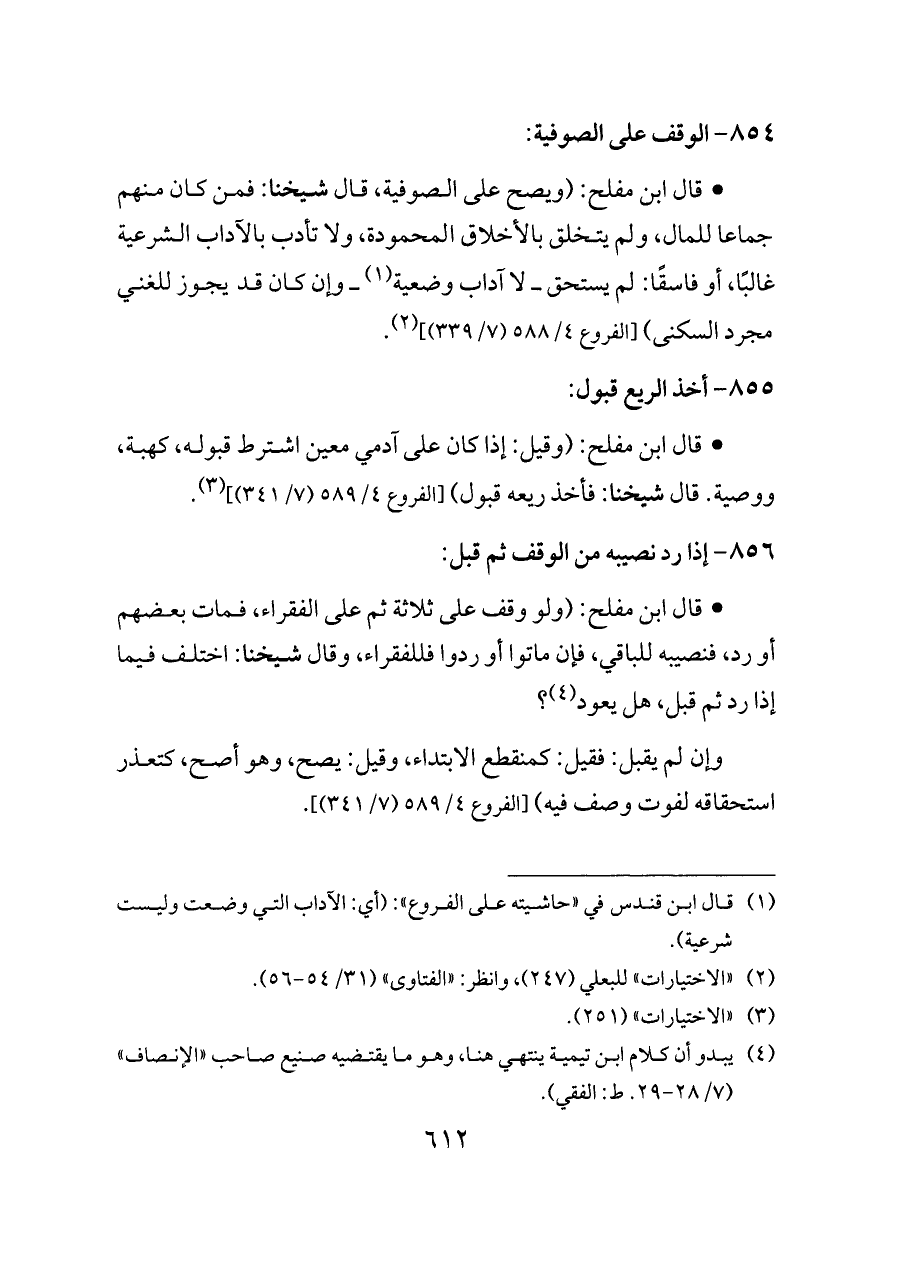 - قال ابن مفلح: (ويصح على الصوفية، قال شيخنا: فمن كان منهم جماعا للمال، ولم يتخلق بالأخلاق المحمودة، ولا تأدب بالآداب الشرعية غالبًا، أو فاسقًا: لم يستحق ــ لا آداب وضعية (¬١) ــ وإن كان قد يجوز للغني مجرد السكنى) [الفروع ٤/ ٥٨٨ (٧/ ٣٣٩)] (¬٢).