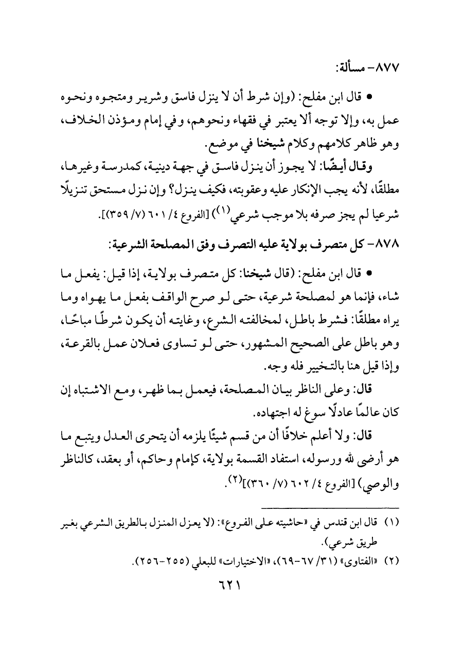 - قال ابن مفلح: (قال شيخنا: كل متصرف بولاية، إذا قيل: يفعل ما شاء، فإنما هو لمصلحة شرعية، حتى لو صرح الواقف بفعل ما يهواه وما يراه مطلقًا: فشرط باطل، لمخالفته الشرع، وغايته أن يكون شرطًا مباحًا، وهو باطل على الصحيح المشهور، حتى لو تساوى فعلان عمل بالقرعة، وإذا قيل هنا بالتخيير فله وجه.
