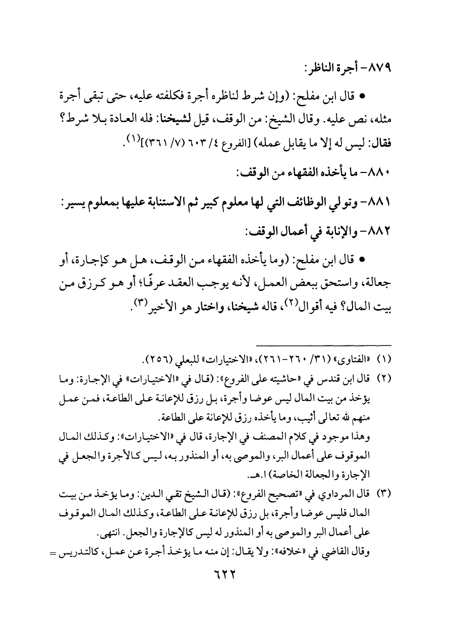 - قال ابن مفلح: (وما يأخذه الفقهاء من الوقف، هل هو كإجارة، أو جعالة، واستحق ببعض العمل، لأنه يوجب العقد عرفًا؛ أو هو كرزق من بيت المال؟ فيه أقوال (¬٢)،