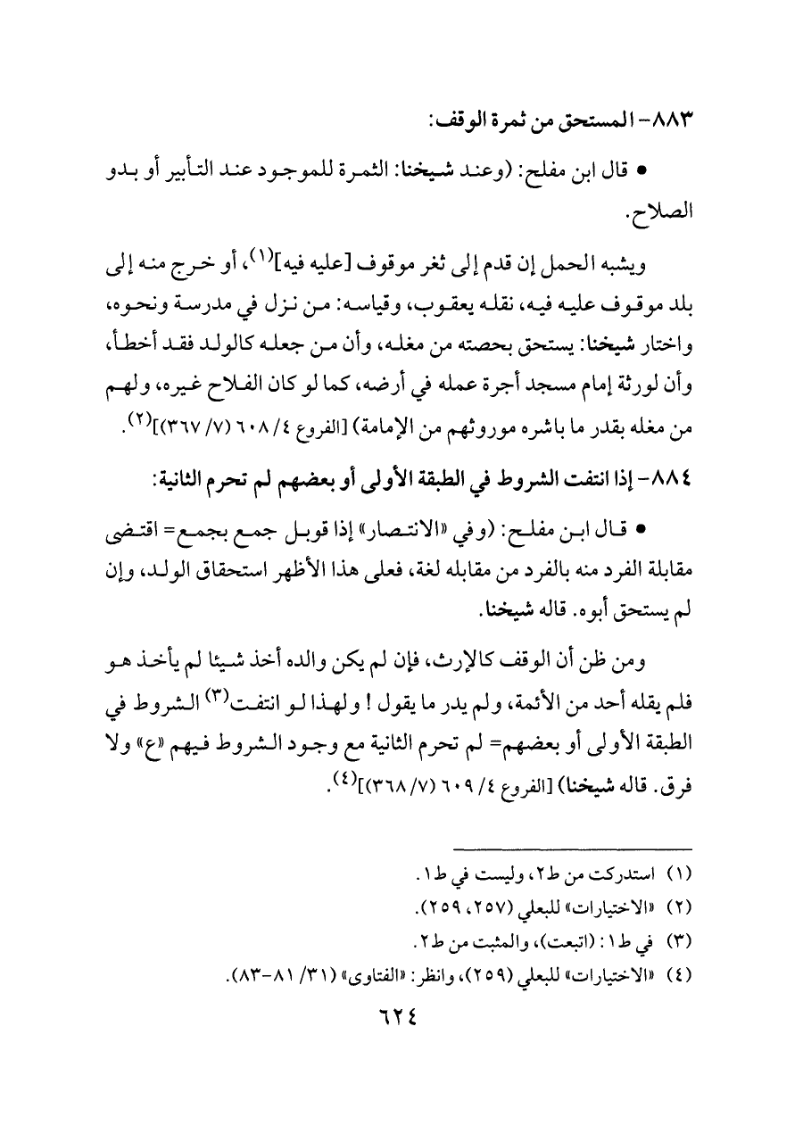 ومن ظن أن الوقف كالإرث، فإن لم يكن والده أخذ شيئا لم يأخذ هو فلم يقله أحد من الأئمة، ولم يدر ما يقول! ولهذا لو انتفت (¬٣) الشروط في الطبقة الأولى أو بعضهم= لم تحرم الثانية مع وجود الشروط فيهم «ع» ولا فرق. قاله شيخنا) [الفروع ٤/ ٦٠٩ (٧/ ٣٦٨)] (¬٤).