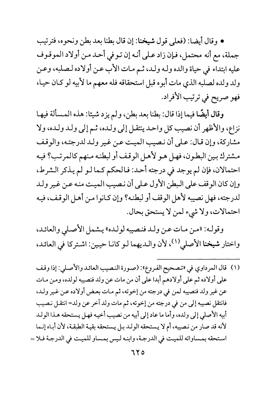 (¬١) قال المرداوي في «تصحيح الفروع»: (صورة النصيب العائد والأصلي: إذا وقف على أولاده ثم على أولادهم أبدا على أن من مات عن ولد فنصيبه لولده، ومن مات عن غير ولد فنصيبه لمن في درجته من إخوته، ثم مات بعض أولاده عن غير ولد، فانتقل نصيبه إلى من في درجته من إخوته، ثم مات ولد آخر عن ولد= انتقل نصيب أبيه الأصلي إلى ولده، وأما ما عاد إلى أبيه من نصيب أخيه فهل يستحقه هذا الولد لأنه قد صار من نصيبه، أم لا يستحقه الولد بل يستحقه بقية الطبقة، لأن أباه إنما استحقه بمساواته للميت في الدرجة، وابنه ليس بمساو للميت في الدرجة فلا يستحقه، ونصيب أبيه هو ما استحقه أبوه بالإحالة دون هذا العائد؟ هذا فيه وجهان، حكاهما أبو العباس - رضي الله عنه -، ورجح الثاني كما أشار إليه المصنف كما ذكرنا، والله أعلم) ا. هـ.