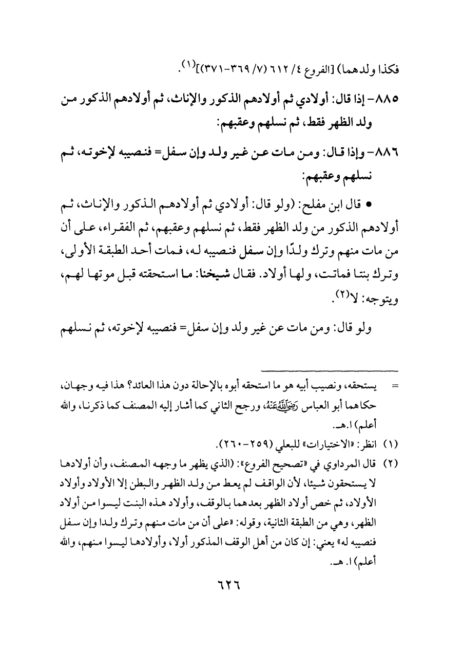 (¬٢) قال المرداوي في «تصحيح الفروع»: (الذي يظهر ما وجهه المصنف، وأن أولادها لا يستحقون شيئا، لأن الواقف لم يعط من ولد الظهر والبطن إلا الأولاد وأولاد الأولاد، ثم خص أولاد الظهر بعدهما بالوقف، وأولاد هذه البنت ليسوا من أولاد الظهر، وهي من الطبقة الثانية، وقوله: «على أن من مات منهم وترك ولدا وإن سفل فنصيبه له» يعني: إن كان من أهل الوقف المذكور أولا، وأولادها ليسوا منهم، والله أعلم) ا. هـ.