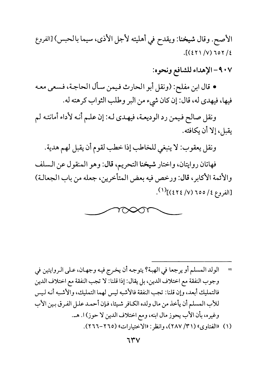 - قال ابن مفلح: (ونقل أبو الحارث فيمن سأل الحاجة، فسعى معه فيها، فيهدى له، قال: إن كان شيء من البر وطلب الثواب كرهته له.
