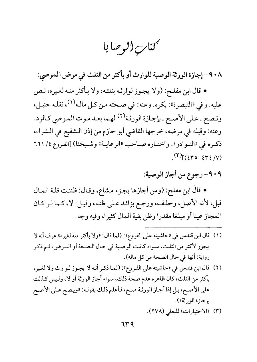(¬٢) قال ابن قندس في «حاشيته على الفروع»: (لما ذكر أنه لا يجوز لوارث ولا لغيره بأكثر من الثلث، كان ظاهره عدم صحة ذلك، سواء أجاز الورثة أو لا، وليس كذلك على الأصح، بل إذا أجاز الورثة صح، فأعلم ذلك بقوله: «ويصح على الأصح بإجازة الورثة»).