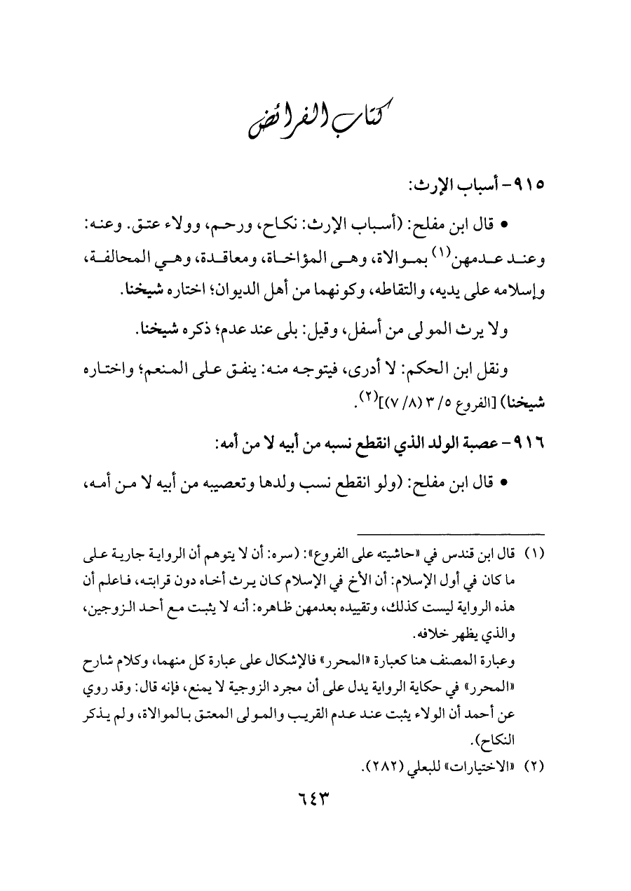- قال ابن مفلح: (أسباب الإرث: نكاح، ورحم، وولاء عتق. وعنه: وعند عدمهن (¬١) بموالاة، وهى المؤاخاة، ومعاقدة، وهي المحالفة، وإسلامه على يديه، والتقاطه، وكونهما من أهل الديوان؛ اختاره شيخنا.
